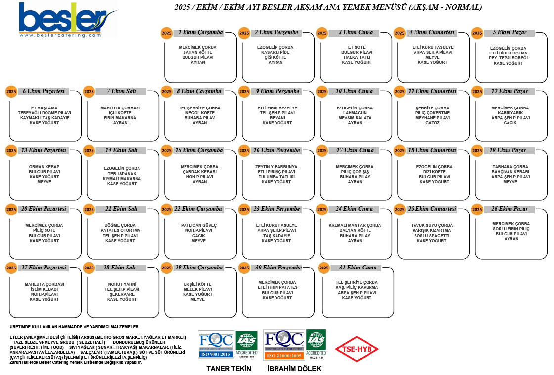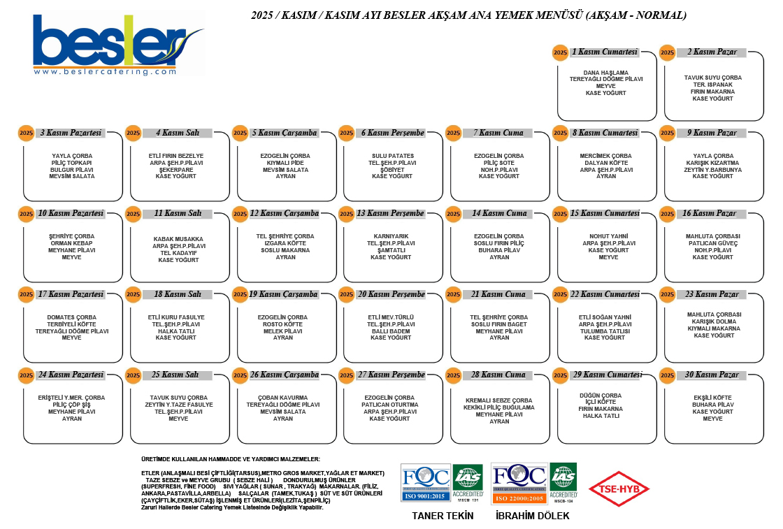 Gün içerisinde en dikkat edilmesi gereken öğün hiç şüphesiz akşam yemeğidir. Çünkü akşam saatlerinde insan metabolizmasının işlevi yavaşlar. Dolayısıyla bu öğünde sağlık açısından daha hafif olarak tabir edilen yemekler tüketilmesi tavsiye edilir. Besler Catering olarak gıda mühendislerimizin denetiminde, gıdaların besin ve kalori değerleri kılı kırk yararcasına dikkat edilerek usta aşçılarımız tarafından hazırlanan enfes, sağlıklı ve doyurucu lezzetlerle program, tören ve organizasyonlarınıza çözümler sunuyoruz. Rahat bir uyku ve ertesi güne dinlenmiş olarak kalkmak için akşam yemeğinizi biz hazırlayalım. Siz keyfini sürün..