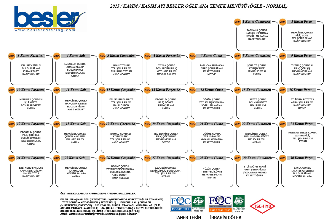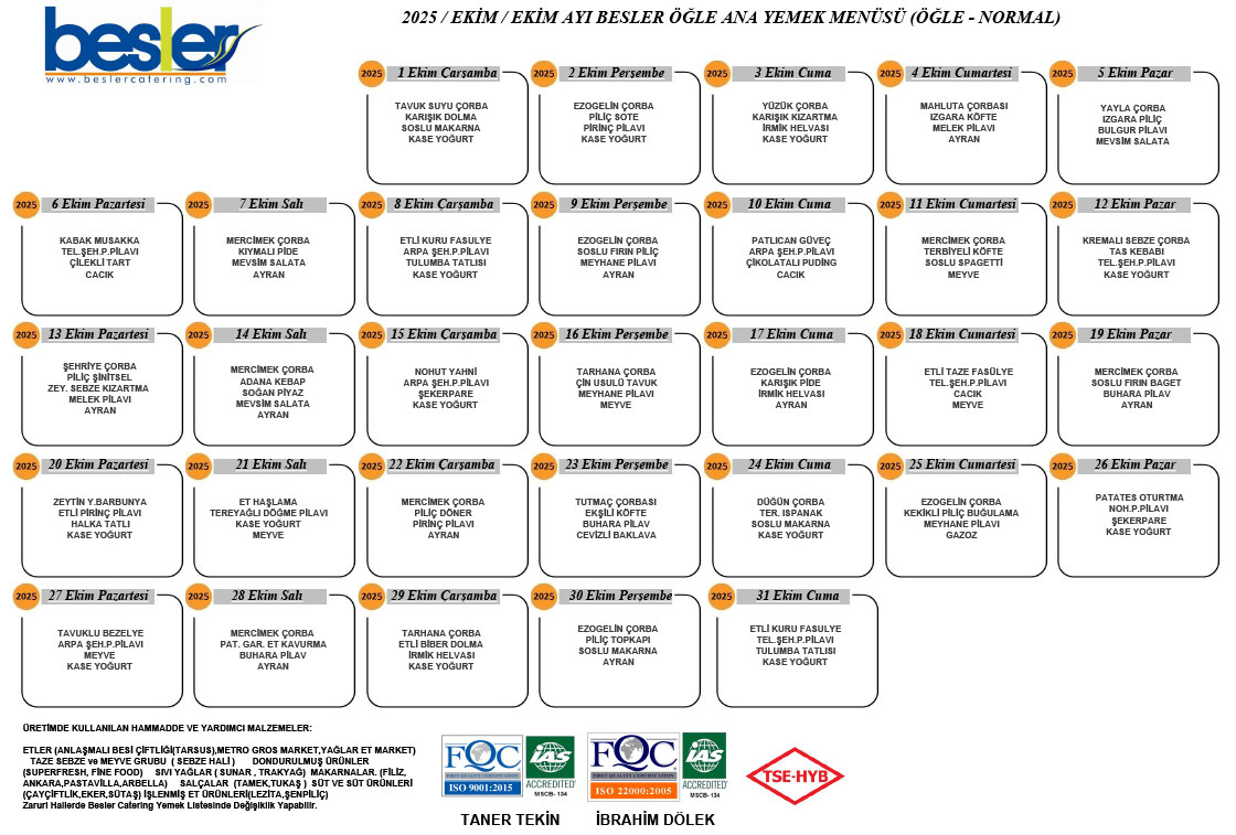 Yoğun iş hayatında çoğu insan öğlen yemeğini ayaküstü aperatiflerle geçiriyor. Halbuki öğlen yemeğinin günlük beslenme düzeninde önemli bir yeri var. Çünkü öğlen yemeği, gün boyu sergilediğimiz fiziksel ve mental performansımıza birebir etki ediyor. Öğlen yemeğini atlamak insanların kan şekeri dengesini bozduğu için halsiz kalmasına ve stres düzeyinin artmasına da neden oluyor. Her türlü kurum, kuruluş, davet, tören ve organizasyonlarınızda gıda mühendislerimizin denetiminde usta açılarımızın ellerinden çıkan öğlen yemeğine özgü birbirinden nefis lezzetler ile ihtiyacınız olan enerjiyi sizlere sağlamak bizim sorumluluğumuzdadır. Yemek düzeni aslında insanların yaşam kalitesi açısından da önemlidir. Gün içinde dengeli ve sağlıklı beslenme aynı zamanda uyku düzeni içinde gereklidir. Böylece vücut dengeli ve düzenli beslenme ile hastalıklara karşı bağışıklığı yüksek, dirençli bir yapıya kavuşacaktır. Günümüz koşullarında öncelikli olan bağışıklık sistemi için beslenmenize dikkat etmeniz gerekiyor. Bırakın beslenmenize biz dikkat edelim sizin için.