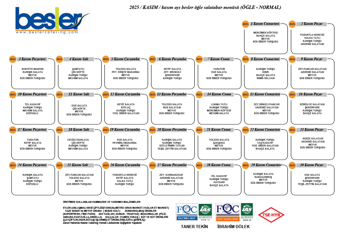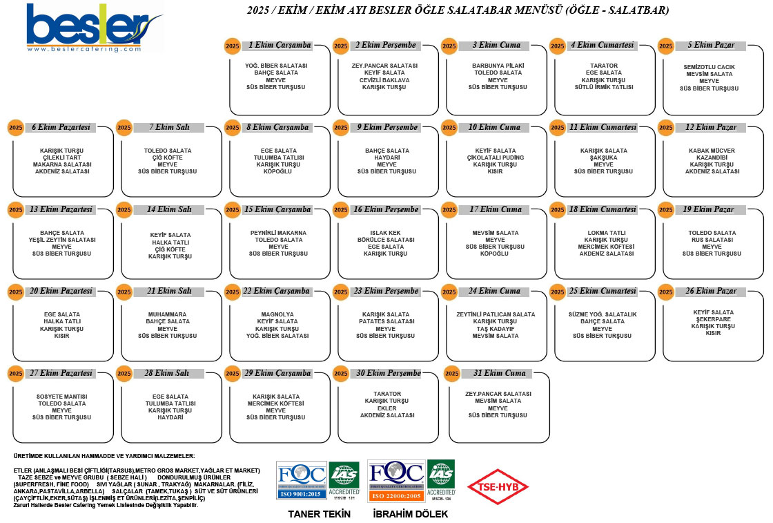 Yoğun geçen günün dinlenme vakitlerinden biri de yemek saatleridir. Günlük gıdamızı alarak enerjimizi topladığımız bu saatlerin en vazgeçilmez lezzetlerinden biri de salata menüsüdür. Besler Catering olarak hazırladığımız salata bar menüleri ile sizi dinç ve fit tutarak gün için gerekli olan enerjiyi sağlayabileceğiniz hafif lezzetlere kavuşturacağız. Gıda mühendislerimizin denetiminde her türlü kalori ve sağlık değerleri hesaplanarak oluşturulan salata bar menümüz ile sizlere hafif ve sağlıklı öğünler sunarak yaşam kalitenizi artırıyoruz. Kendinizi daha enerjik hissedip daha fit bir hayat süreceğiniz lezzetli aylık salata bar menümüze aşağıdan ulaşabilirsiniz.